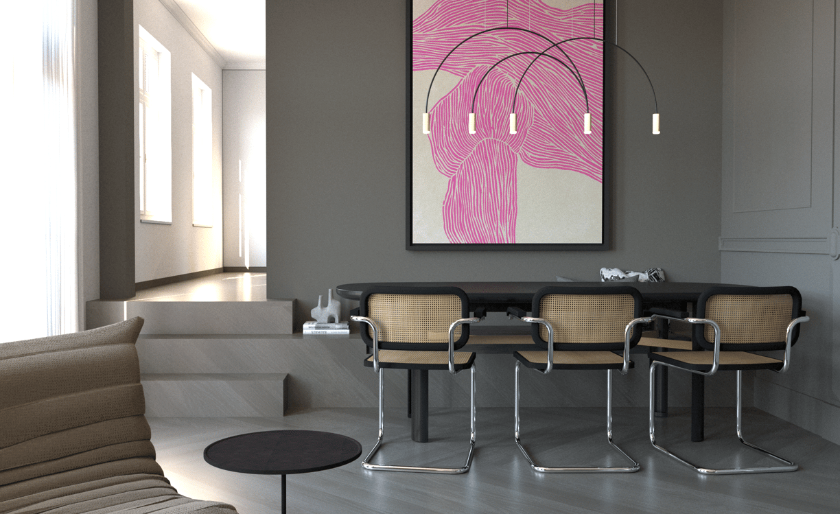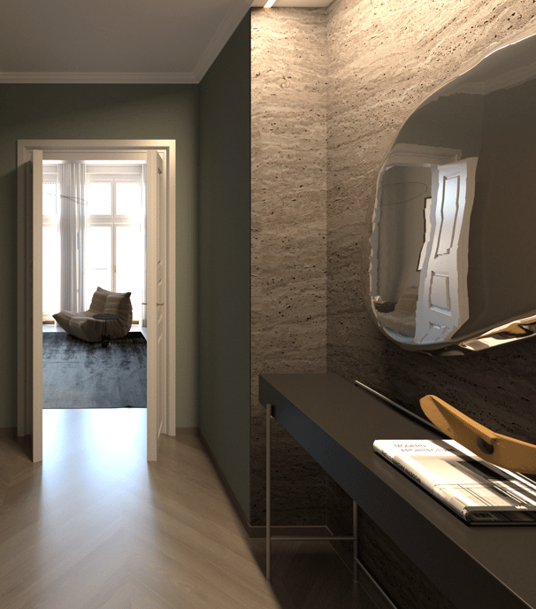 Ein großer Spiegel gegenüber vom Bett vergrößert den Raum optisch und reflektiert das natürliche Licht, das durch die großen Fenster hereinfällt.