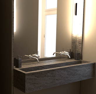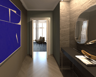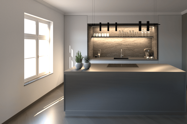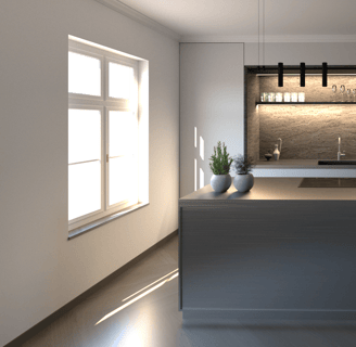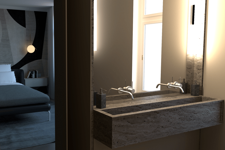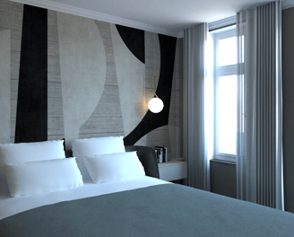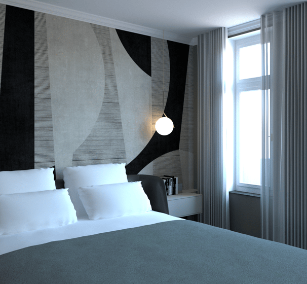 Das Schlafzimmerbild hat eine elegante und moderne Innenausstattung, die eine ruhige und entspannende Atmosphäre schafft. Das Bett ist das zentrale Element des Raumes und strahlt Gemütlichkeit aus. Es ist mit hochwertigen, weißen Bettlaken und Kissen ausgestattet, die einen Hauch von Luxus vermitteln. Passende Vorhänge ergänzen das Bett und verleihen dem Raum eine harmonische Ausstrahlung. Am Bett sind moderne Wandleuchten angebracht,die ein angenehmes Licht spenden.